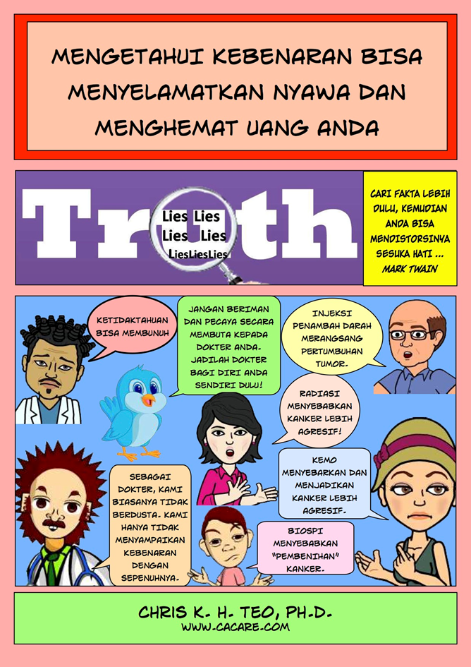 Di dalam buklet ini, saya sudah mencoba memberi anda semua informasi yang anda butuhkan untuk mengetahui tentang perawatan medis bagi kanker. Ini akan mengisi lubang yang tidak diberitahukan dokter onkologi kepada anda. Fakta dan pendapat di dalam buku ini bukan “karangan” atau sekadar imajinasi saya. Semuanya dikutip dari buku-buku atau jurnal-jurnal medis. Meskipun pahit dan susah ditelah, kebenaran-kebenaran ini harus disampaikan. Saya berharap informasi ini bisa menolong anda membuat keputusan yang bijak. Ini hidup anda!